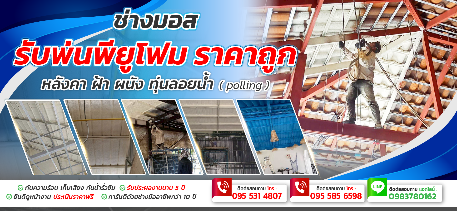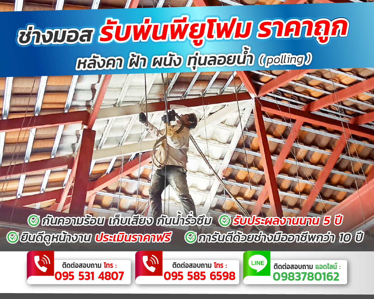 ช่างมอส บริการรับพ่นพียูโฟมราคาถูก พ่นฉนวนโฟมกันความร้อน สำหรับหลังคา ฝ้า ผนัง พื้นห้องเย็น ทุ่นลอยน้ำ และพื้นที่ที่ต้องการ เราเลือกใช้วัสดุคุณภาพสูง พร้อมทีมช่างมากประสบการณ์กว่า 10 ปี พร้อมรับประกันผลงานนานถึง 5 ปี ยินดีให้คำปรึกษา วัดพื้นที่ ประเมินราคาฟรี ไม่มีค่าใช้จ่าย